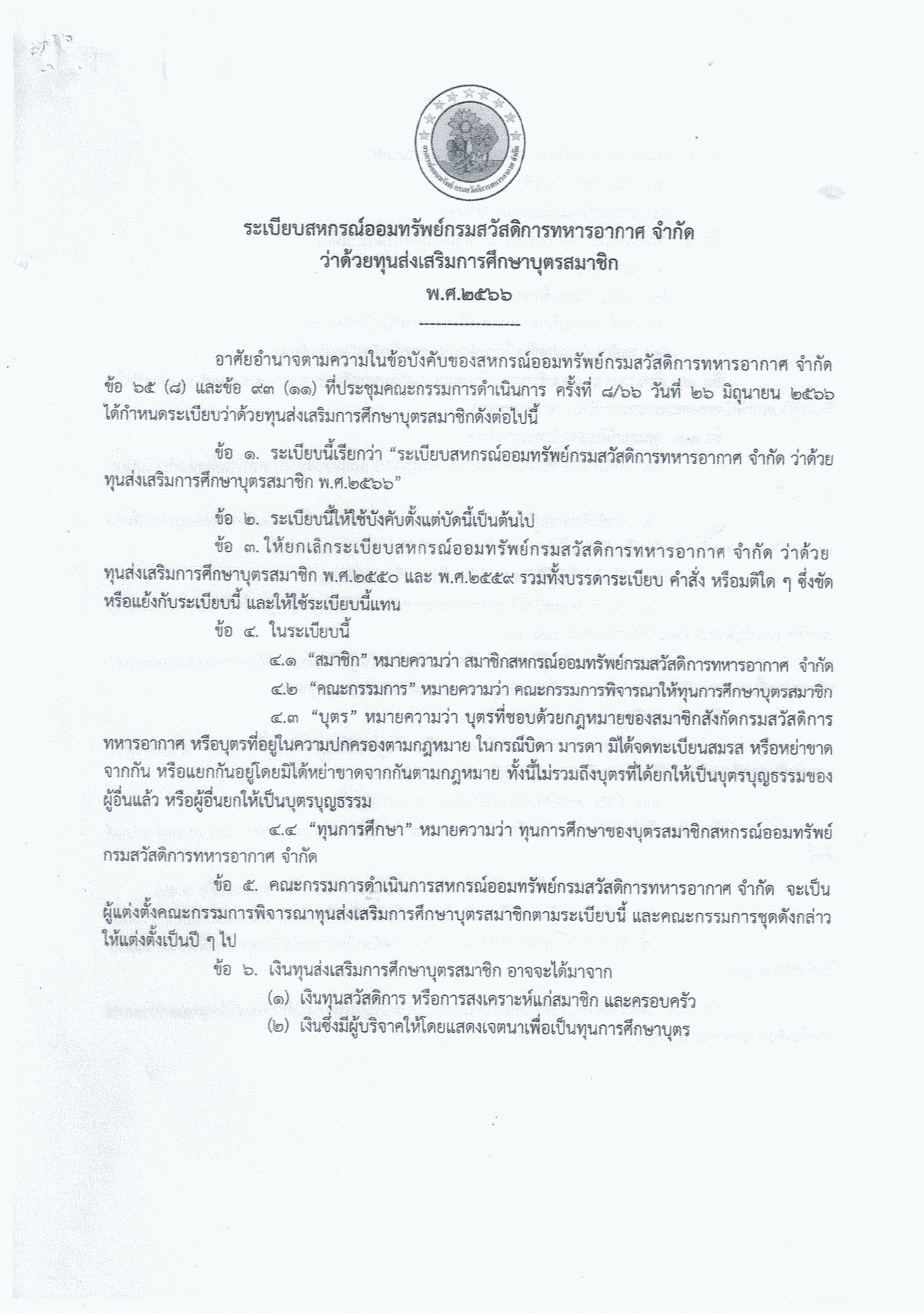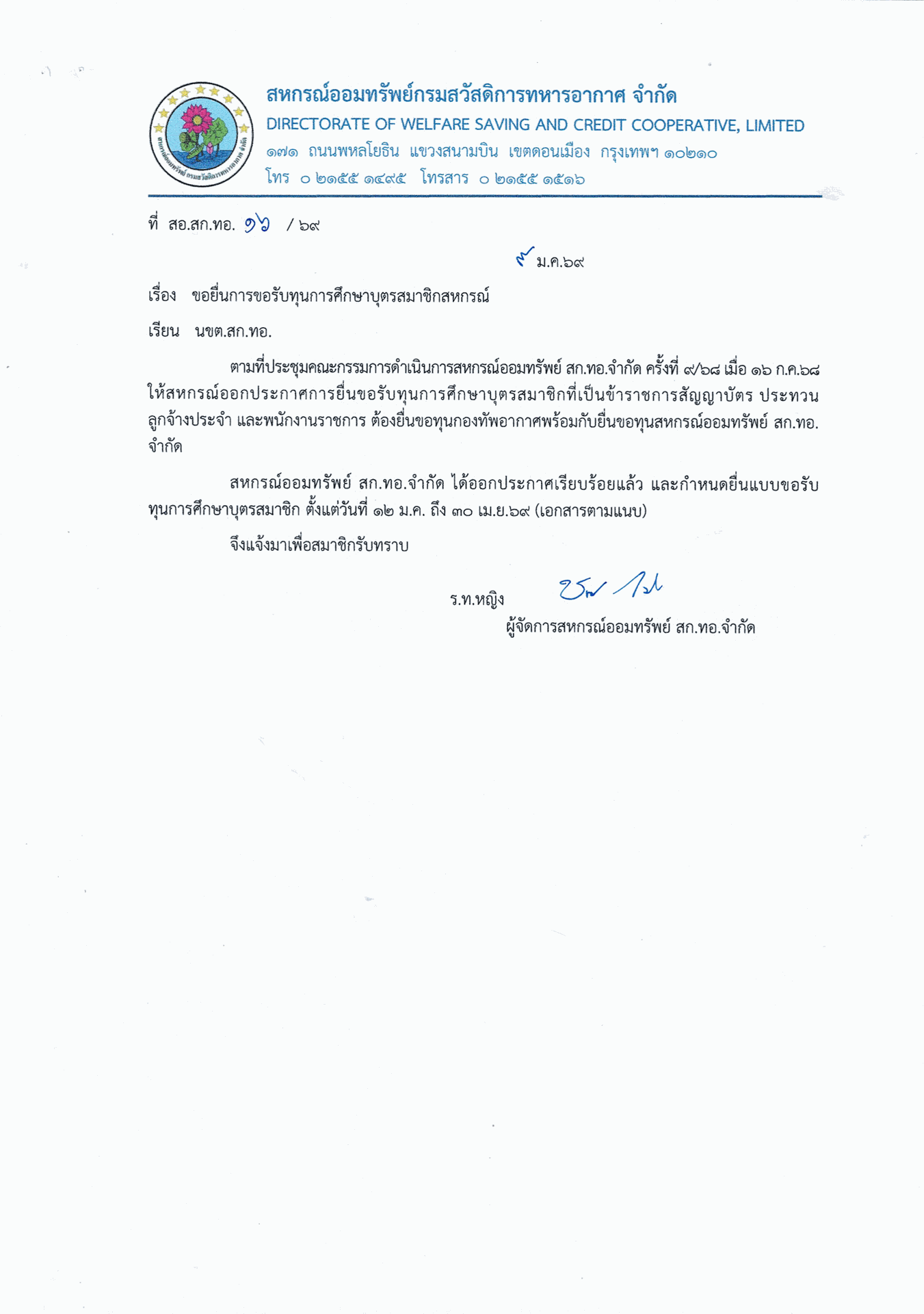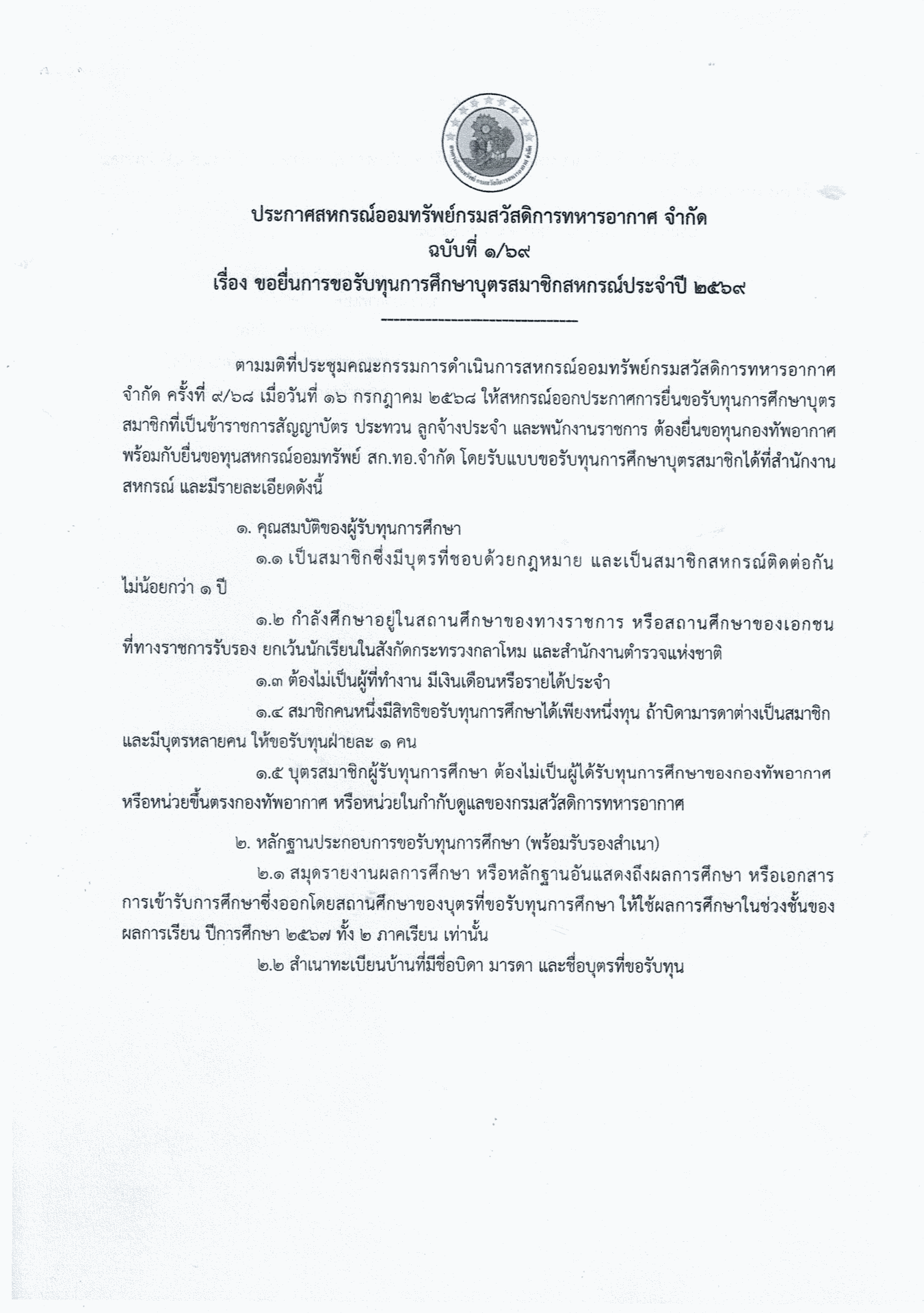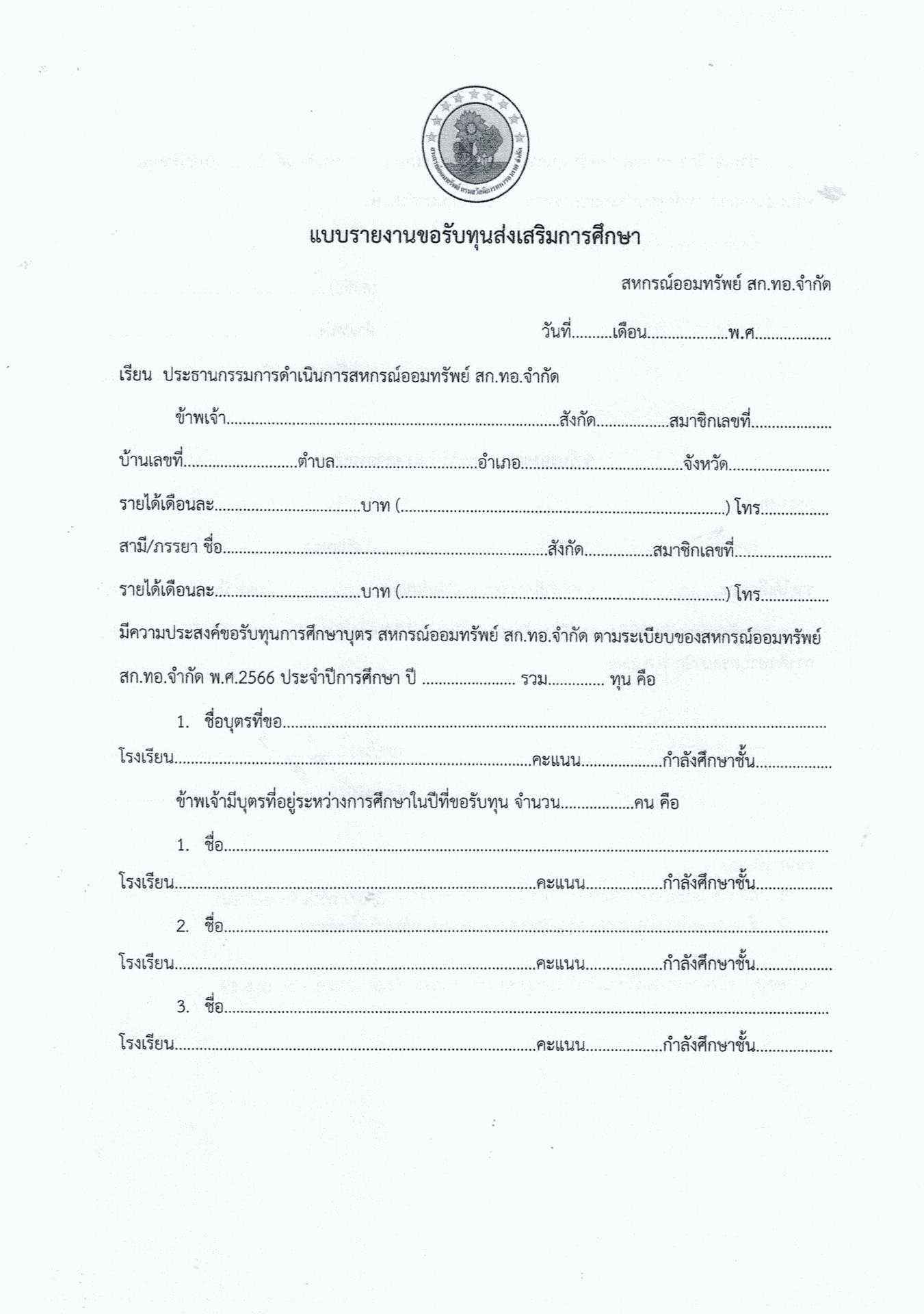 การขอรับทุนการศึกษาบุตรสมาชิกสหกรณ์ สหกรณ์ออมทรัพย์กรมสวัสดิการทหารอากาศ จำกัด