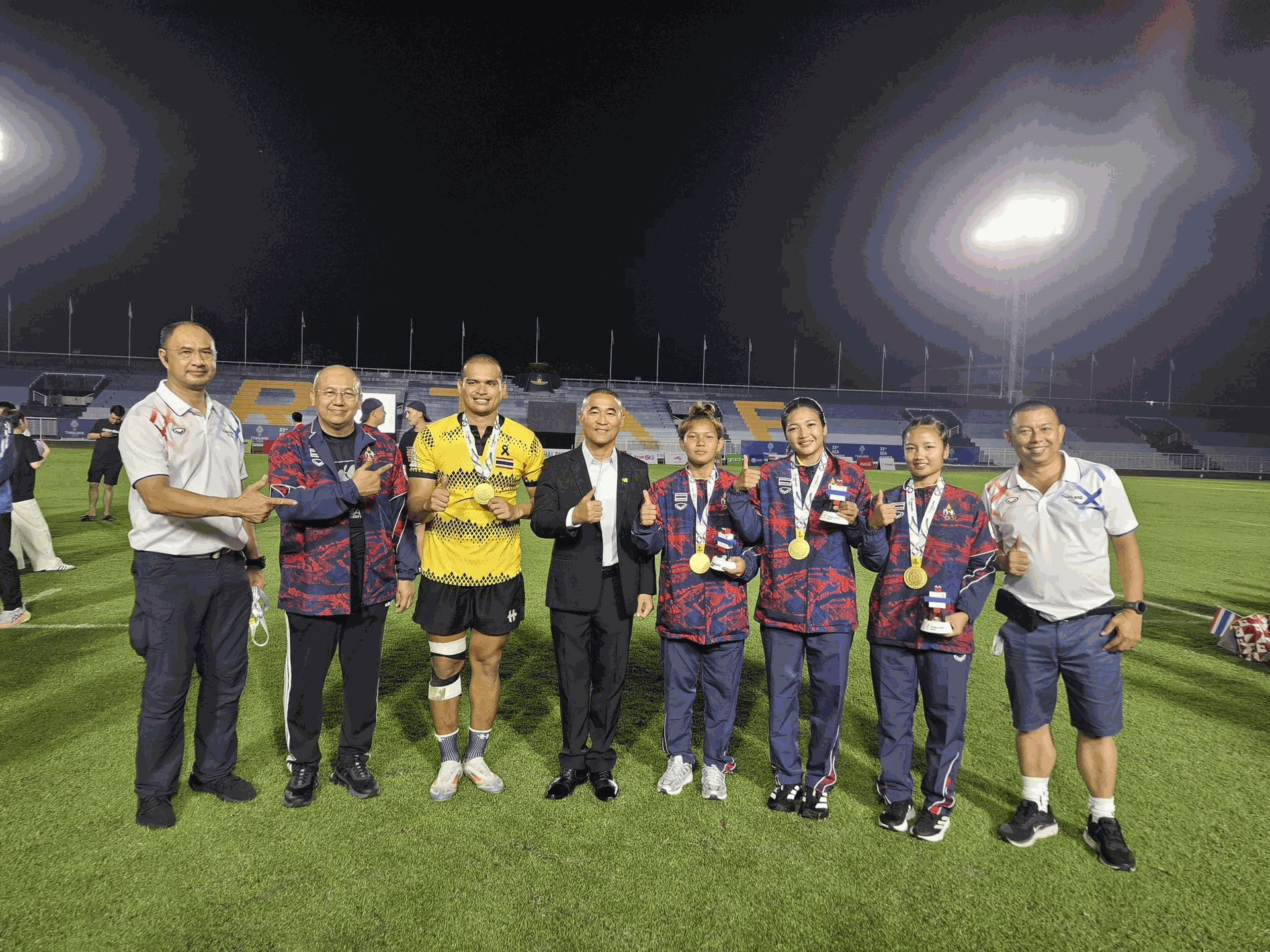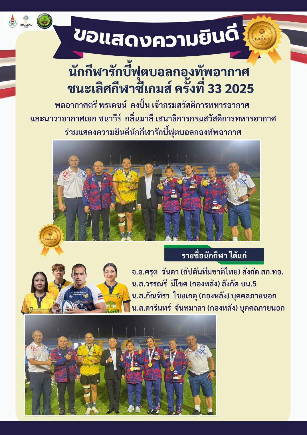 กรมสวัสดิการทหารอากาศ ขอแสดงความยินดีกับนักกีฬารักบี้ทีมชาติไทย ที่สร้างผลงานอันยิ่งใหญ่ คว้า 2 เหรียญทอง จากการแข่งขันกีฬาซีเกมส์ ครั้งที่ 33 ทั้งในประเภททีมชายและทีมหญิง นับเป็นความสำเร็จครั้งแรกในรอบ 18 ปี ที่ทีมรักบี้ไทยสามารถคว้าเหรียญทองได้พร้อมกันทั้งสองทีม สร้างความภาคภูมิใจให้กับประเทศชาติอย่างยิ่งสำหรับผลการแข่งขัน ประเภททีมชาย ทีมชาติไทยเอาชนะคู่แข่งไปด้วยคะแนน 10–5 จุด แสดงถึงศักยภาพ ความแข็งแกร่ง และจิตวิญญาณนักสู้ของนักกีฬาไทย ขณะที่ประเภททีมหญิง ทีมรักบี้สาวไทยโชว์ฟอร์มได้อย่างยอดเยี่ยม เอาชนะไปแบบขาดลอย 37–0 จุด ป้องกันแชมป์ได้เป็นสมัยที่ 5 ติดต่อกัน และนับเป็นครั้งแรกในประวัติศาสตร์ที่ทีมรักบี้สาวไทยไม่เสียแต้มตลอดการแข่งขันรักบี้ในกีฬาซีเกมส์การแข่งขันดังกล่าวจัดขึ้น ณ ศูนย์พัฒนากีฬากองทัพอากาศ (สนามธูปะเตมีย์) เป็นสนามฯ ที่กองทัพอากาศได้ให้การสนับสนุนการจัดแข่งขัน ซึ่งเป็นสนามมาตรฐานที่มีความพร้อมทั้งด้านสถานที่ อุปกรณ์ ความปลอดภัย และการอำนวยความสะดวก เพื่อให้การแข่งขันเป็นไปอย่างราบรื่นและสร้างความประทับใจแก่ผู้เข้าร่วมทั้งในและต่างประเทศกรมสวัสดิการทหารอากาศ ขอชื่นชมและยกย่องความมุ่งมั่น ทุ่มเท และความเสียสละของนักกีฬา ผู้ฝึกสอน และผู้เกี่ยวข้องทุกฝ่าย ที่ร่วมกันสร้างผลงานประวัติศาสตร์ครั้งสำคัญนี้ พร้อมทั้งขอเป็นกำลังใจให้นักกีฬารักบี้ทีมชาติไทยสร้างชื่อเสียงและความภาคภูมิใจให้แก่ประเทศชาติอย่างต่อเนื่องต่อไป