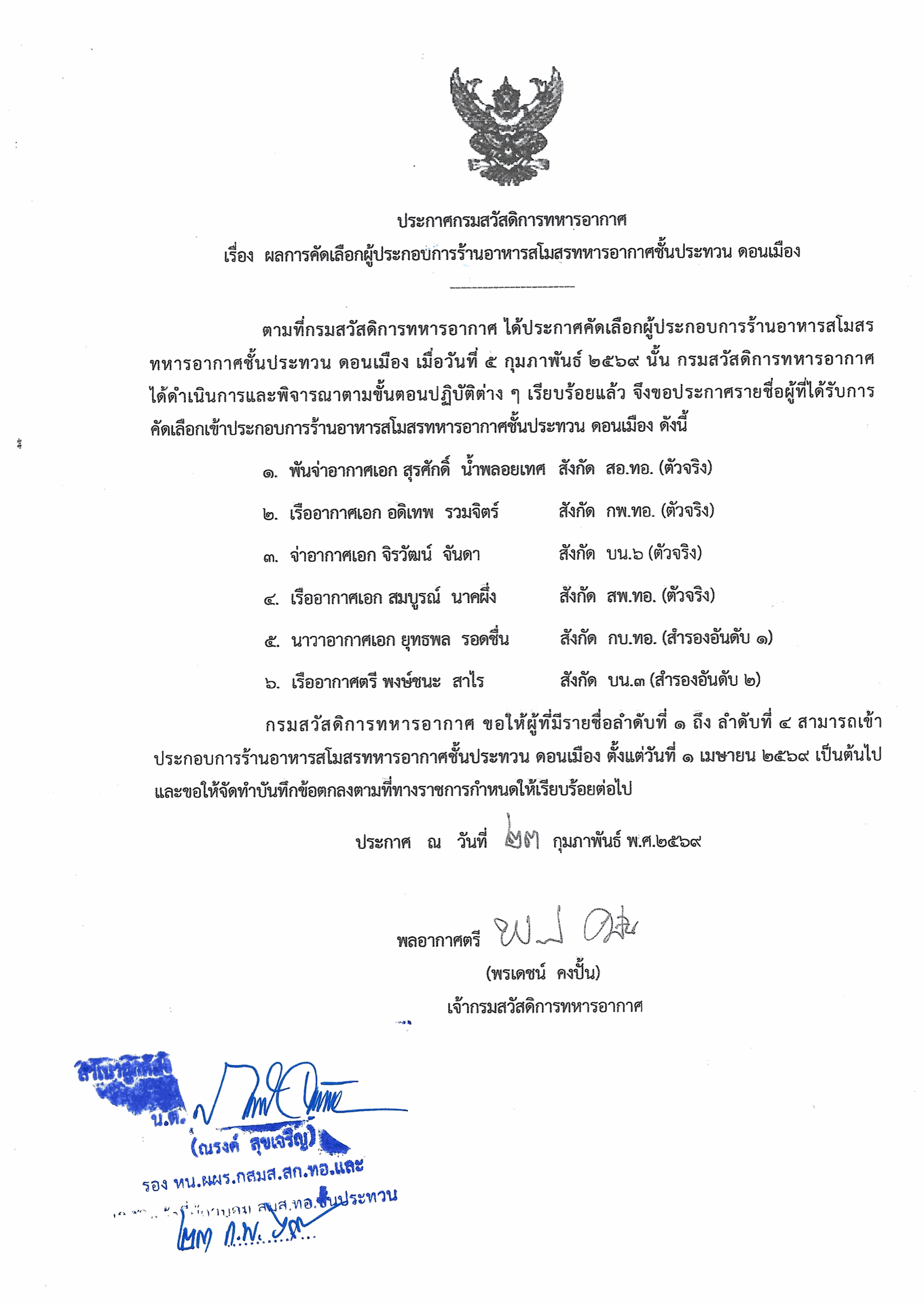 ผลการคัดเลือกผู้ประกอบการร้านอาหารสโมสรทหารอากาศชั้นประทวน ดอนเมือง